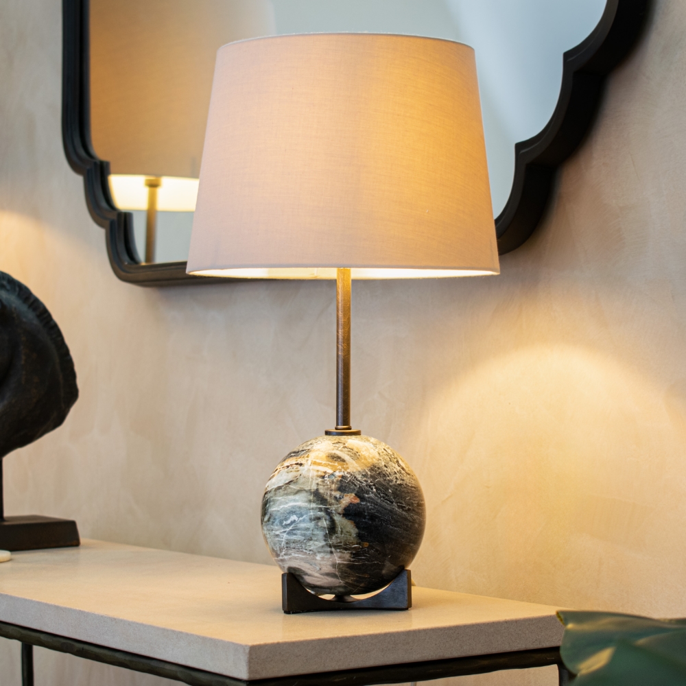 The Halvard Floor Lamp is a striking statement piece that combines luxurious materials with a sculptural, modern design. Featuring a solid spherical base crafted from pistachio marble, this floor lamp showcases natural veining and soft green tones, ensuring each piece is beautifully unique. Rising from the marble base is a sleek dark bronze stem, complemented by matching bronze detailing that adds depth and contrast to the design. The combination of rich metal and natural stone creates a refined balance, making the Halvard floor lamp ideal for contemporary, modern, and design-led interiors.