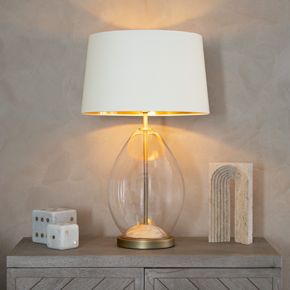 The Kallestad Bronze Table Lamp (Base Only) features a clear glass base with a smooth, rounded silhouette, creating a clean and contemporary profile. A dark bronze stem runs through the centre and is supported by a matching circular base plate. Inside the glass is a solid dome made from grey alabaster. The alabaster displays soft and warm tones with delicate, organic veining. Each piece is unique, adding a refined and elevated detail to the design. The combination of clear glass, grey alabaster and dark bronze creates a layered look, balancing modern materials with a softer, organic element. Due to this being a base only lamp, we have paired this with our 40cm shades.