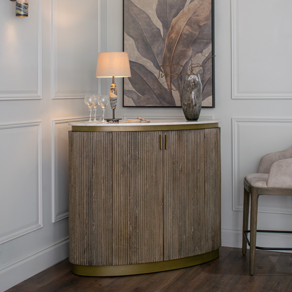 The Maigue 1 Drawer Side Table brings timeless sophistication to any room with its beautifully balanced mix of materials and refined detailing. Its elegant antique brass rim adds a warm, luxurious accent that frames the piece with subtle shine. Below, a ribbed wooden base introduces rich texture and depth, giving the table an artisanal, architectural presence that stands out in both modern and classic interiors. Topped with a neutral marble surface, the Maigue offers a smooth, natural finish that complements its sculptural form while providing a practical, durable surface for everyday use. The discreet single drawer adds convenient storage.