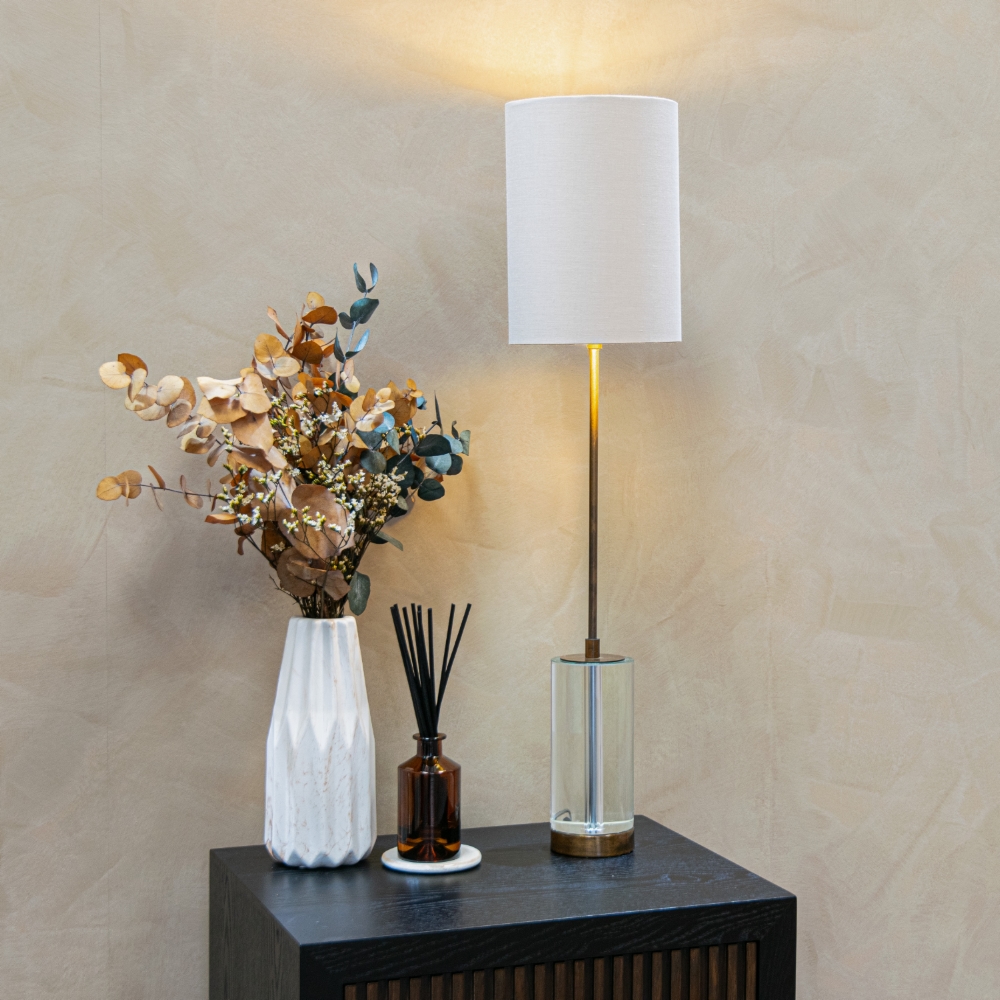 The Reno Table Lamp exudes a refined blend of modern simplicity and classic charm. Its base features an elegant combination of antique brass and clear crystal, creating a sophisticated contrast between warm metallic tones and the sleek transparency of the crystal. The slim, antique brass rod extends upwards, leading to a soft latte-coloured drum shade that adds a calming and neutral element to the lamp's design. The soft hue of the shade provides a gentle, ambient light, perfect for creating a warm and inviting atmosphere. Perfect for side tables, nightstands, or desks, this lamp brings both functional light and a touch of understated luxury.