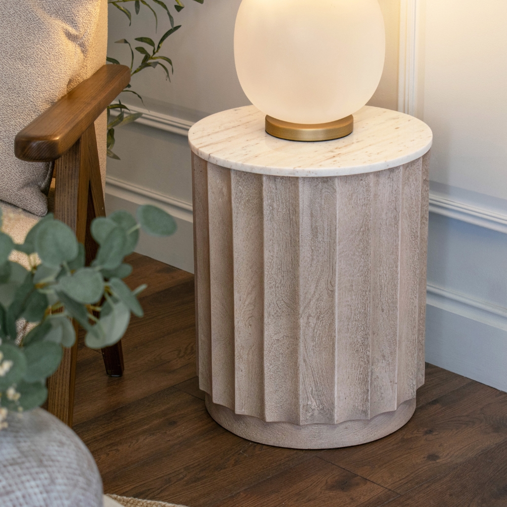The Astri Coffee Table features an understated silhouette, defined by vertical, fluted panelling, that adds depth and architectural interest from every angle. Finished in wood with natural grain variation, it is paired with a smooth marble top, creating a balanced contrast of materials. Well suited to both residential and hospitality interiors, the Astri offers practical surface space while adding subtle detail to a living area scheme.