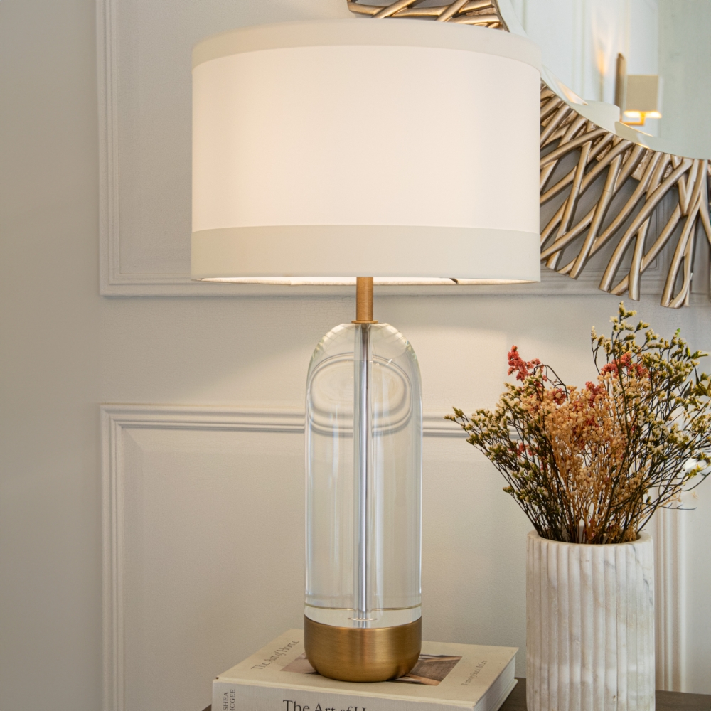 The Cale Table Lamp offers a chic design that will work in any contemporary, modern or chic scheme. Designed to be outstanding, this table lamp features a gorgeous hourglass crystal base accented by antique brass, making this a timeless classic in design. Finished with a round taupe shade to emit a soft light to make a breath-taking finishing touch to any modern or contemporary scheme.