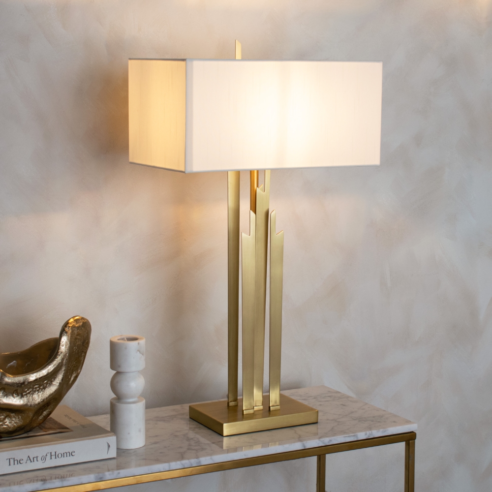 The Carrick Pale Gold Table Lamp was inspired by the skyscrapers of New York and London, and this lamp features metal structures that extend upward from a metal base. Finished with a rectangular shade, it presents a striking silhouette that enhances any interior setting. The Carrick Pale Gold Table Lamp can elevate a space when styled in pairs on either side of a bed or placed individually in a hallway.
