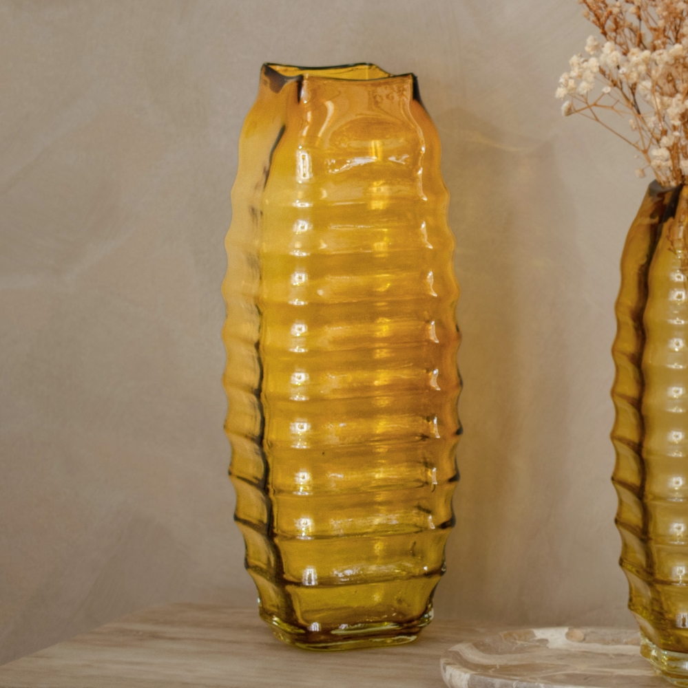The Ellingsen Small Vase delivers sculptural charm. Crafted from tinted yellow glass, this vase introduces a warm, luminous accent that subtly enhances surrounding décor. Its square base creates a clean, contemporary profile, while the ribbed glass detailing adds texture and depth, allowing light to play beautifully across the surface. Ideal for smaller floral arrangements, single stems, or as a decorative object on its own, the Ellingsen Small Vase is perfectly suited to coffee tables, shelving, and bedside tables. Its refined proportions make it easy to layer with other decorative pieces while still standing out as a statement.