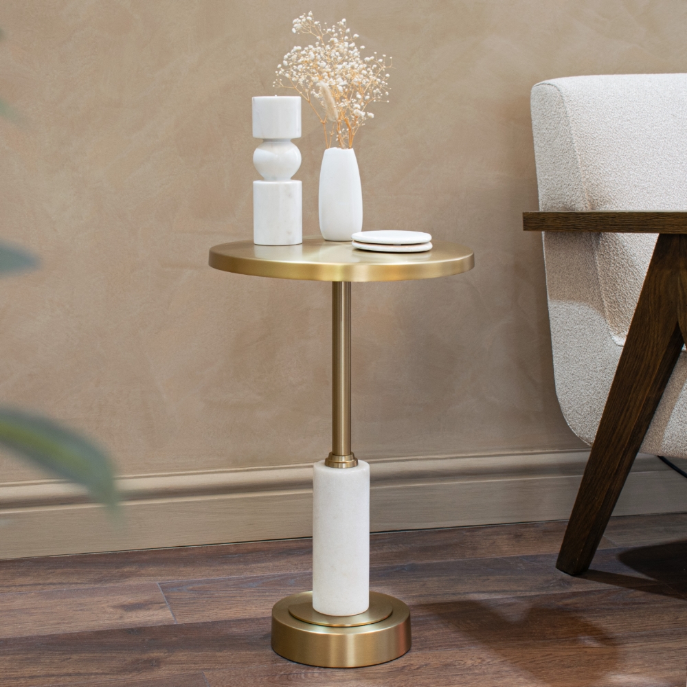 The Erdre Bronze Side Table is a sophisticated statement piece that blends rich materials with a refined, contemporary design. Crafted with a dark bronze top and base, this elegant side table exudes warmth and depth, creating a striking presence in any living space. At its centre, a grey alabaster accent introduces a natural element, showcasing subtle veining and tonal variation that makes each piece uniquely distinctive. This contrast between smooth stone and metallic finishes adds texture and visual interest, elevating the overall design. Perfect for use beside a sofa, armchair, or as a stylish accent table, the Erdre side table combines functionality with sculptural appeal.