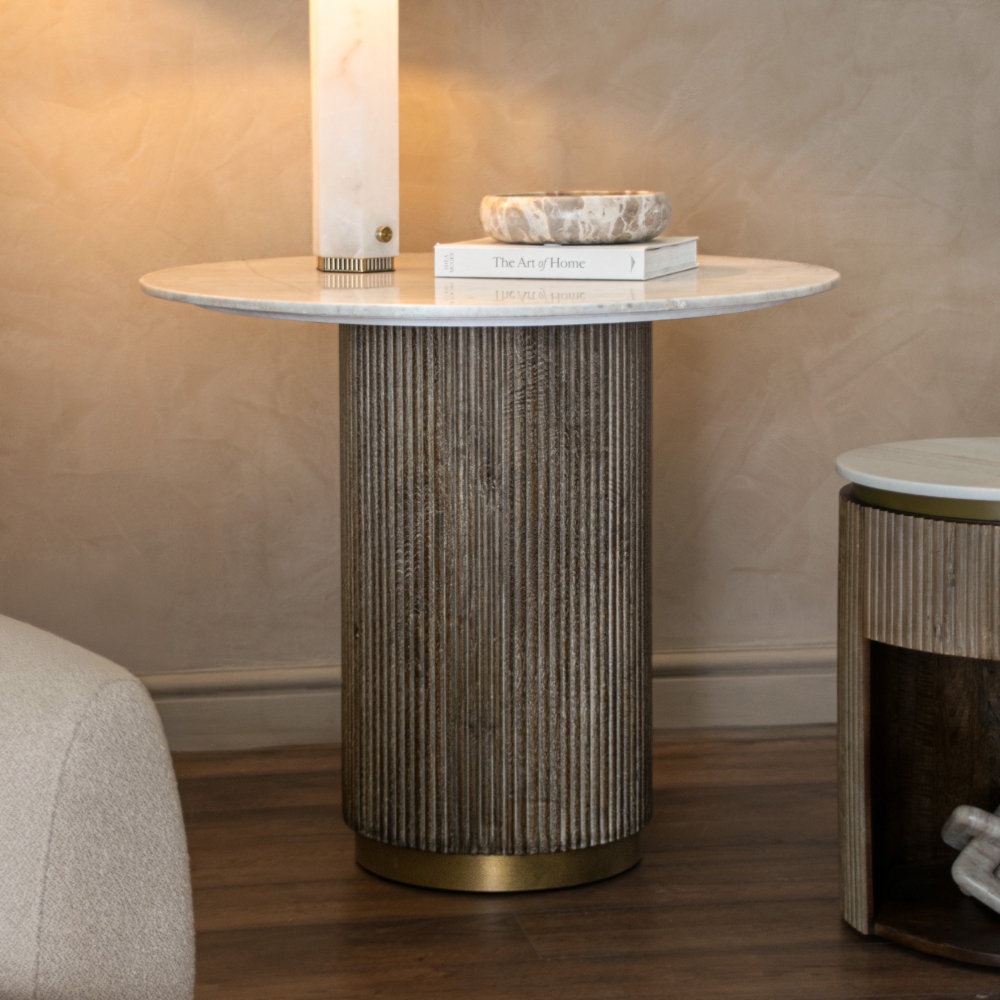 The Maigue 1 Drawer Side Table brings timeless sophistication to any room with its beautifully balanced mix of materials and refined detailing. Its elegant antique brass rim adds a warm, luxurious accent that frames the piece with subtle shine. Below, a ribbed wooden base introduces rich texture and depth, giving the table an artisanal, architectural presence that stands out in both modern and classic interiors. Topped with a neutral marble surface, the Maigue offers a smooth, natural finish that complements its sculptural form while providing a practical, durable surface for everyday use. The discreet single drawer adds convenient storage.