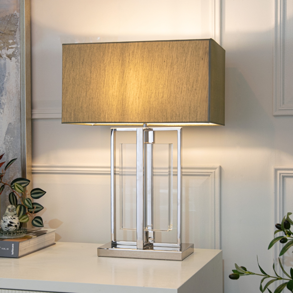 The Ryston Table Lamp finished in antique brass and crystal with a grey rectangular shade is pleasing to the eye and is a striking designed lamp that will add a striking sculptural element to any interiors.